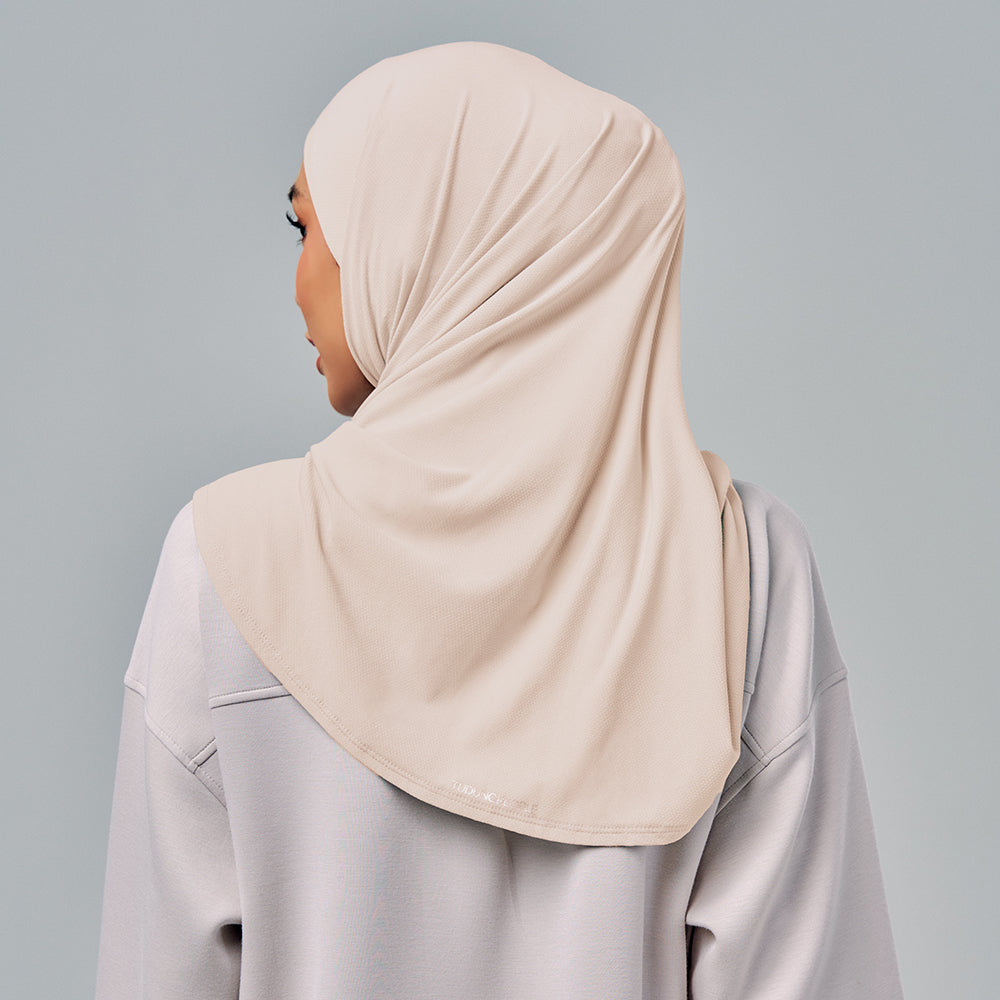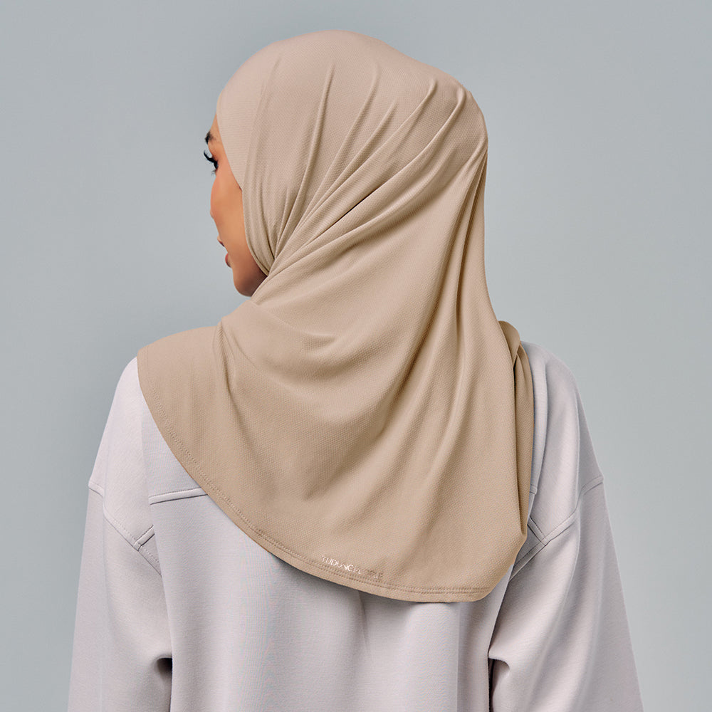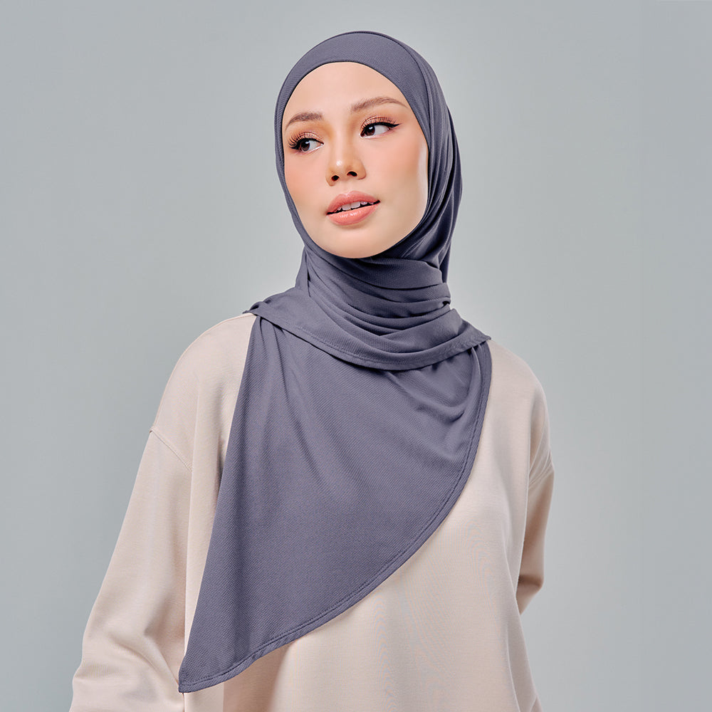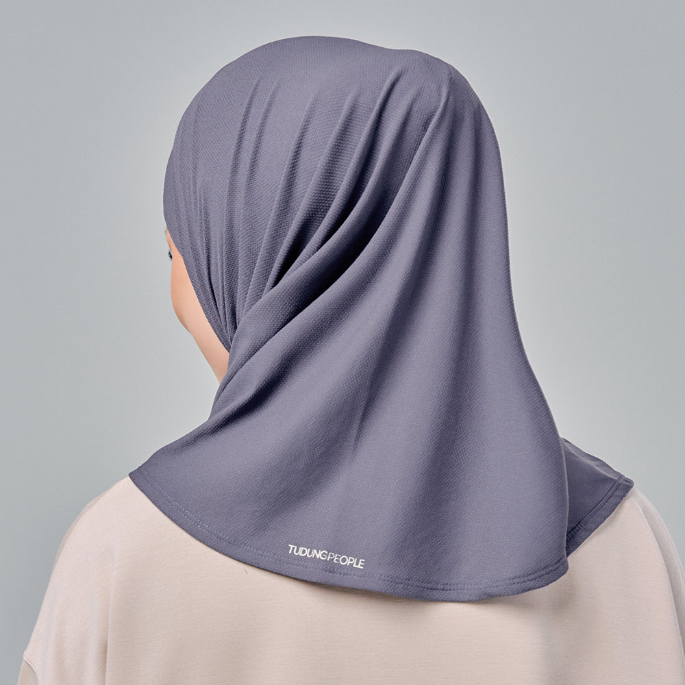 Semi-instant sports hijab in triangle cutting with an attached inner necktie. Freedom to move and easy to style.